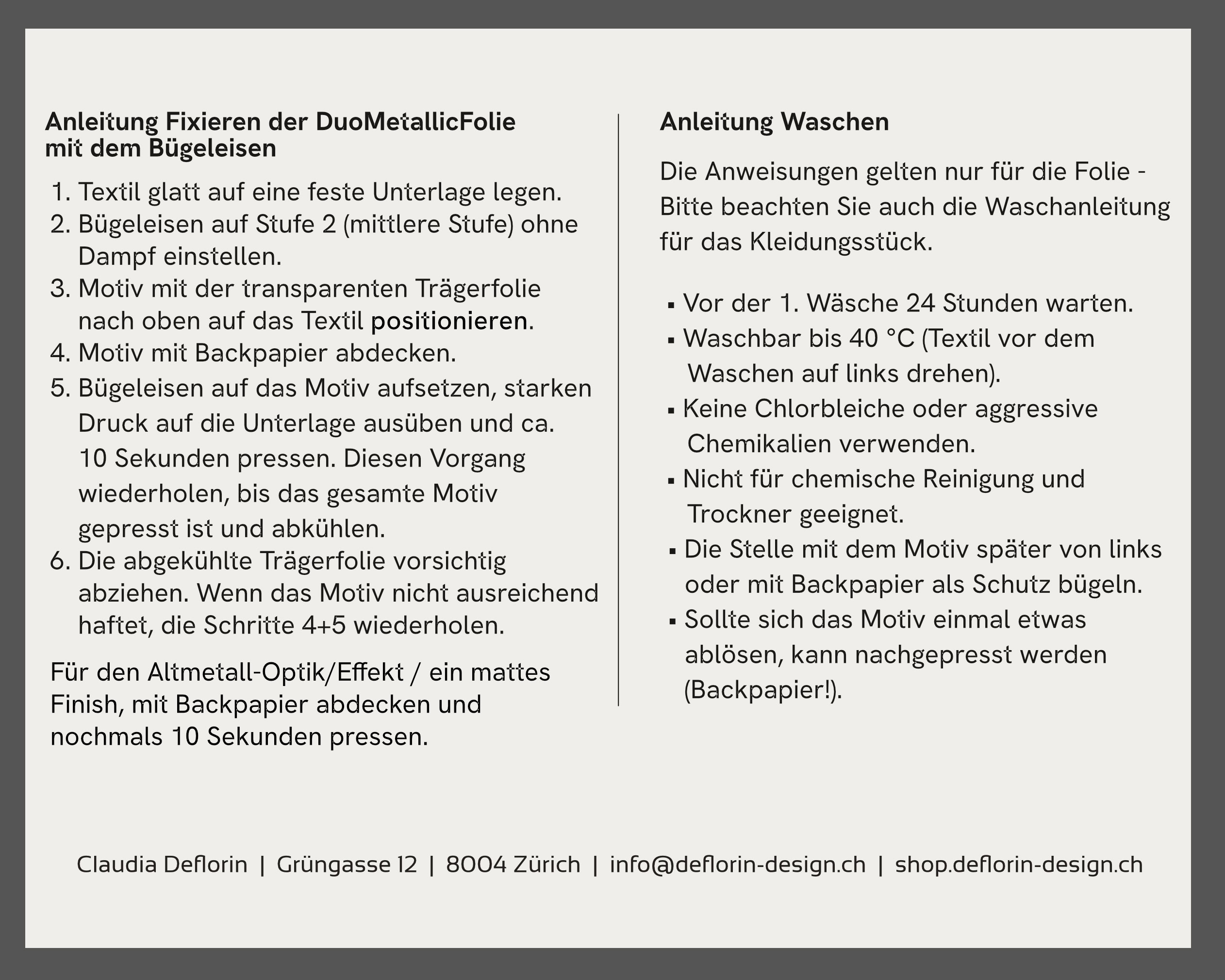 Trägerfolie KALT abziehen. Für den Altmetall-Optik-Effekt / ein mattes Finish, mit Backpapier abdecken und nochmals 10 Sekunden pressen.